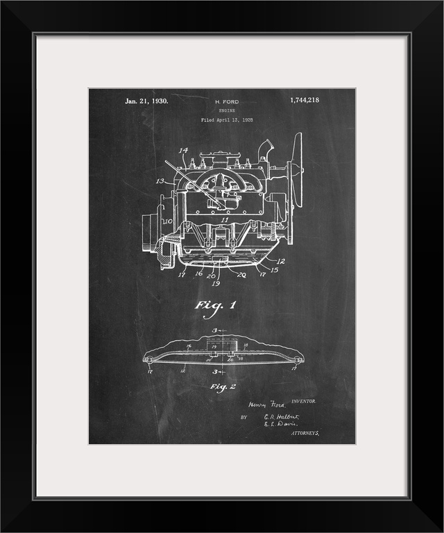 <p>Black and white diagram showing the parts of Henry Ford's engine.</p>