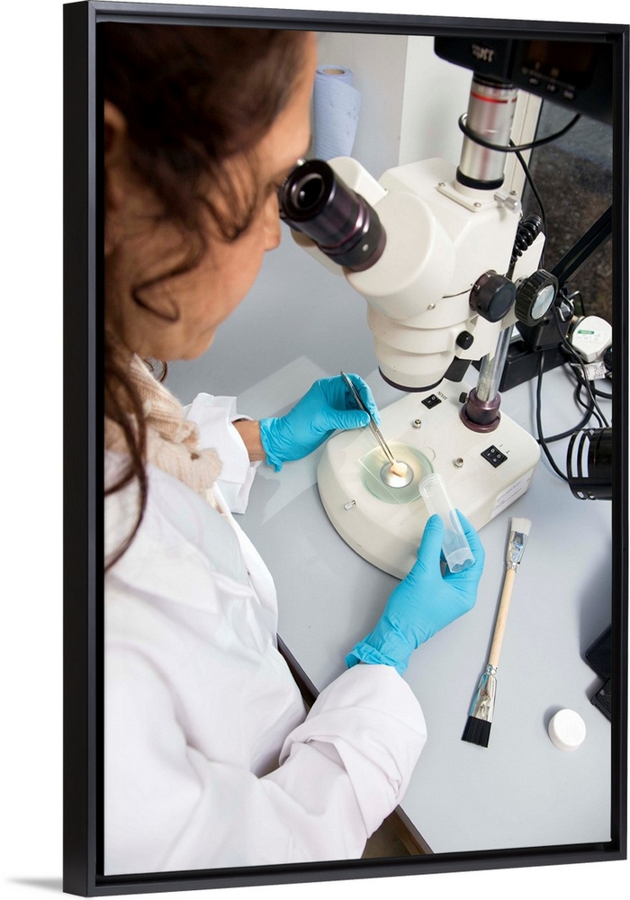 <p>MODEL RELEASED. Bone analysis. Forensic scientist using a high-powered optical microscope to examine a fragment of human bone. Bone from a dead body can be examined for evidence coning the cause of death. Examination of bones can help identify a body's age, gender, height and sometimes race.</p>