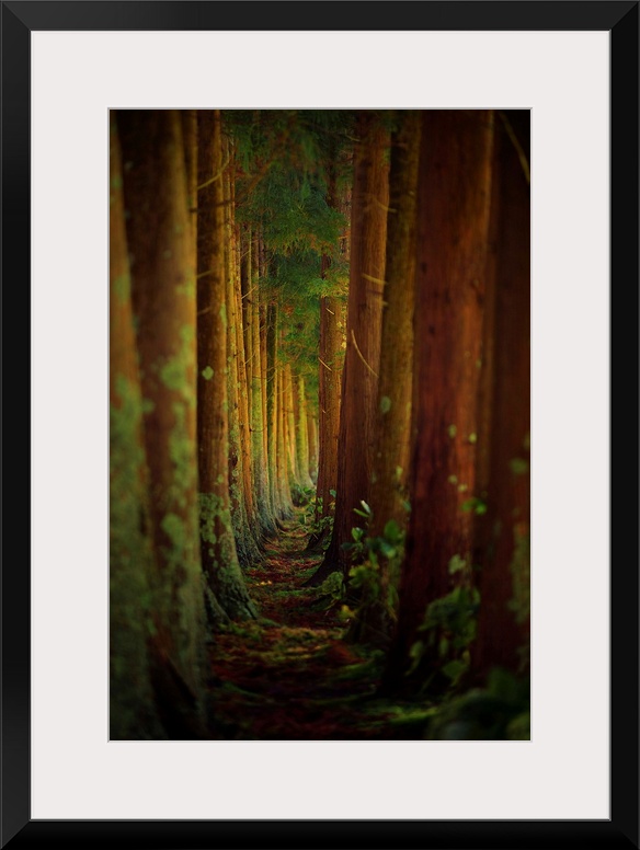 <p>Looking through the narrow grove of trees in a forest.</p>