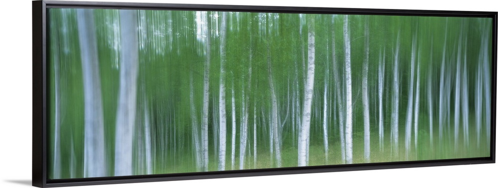 <p>Blurred shot of leaf covered birch trees in a forest.</p>