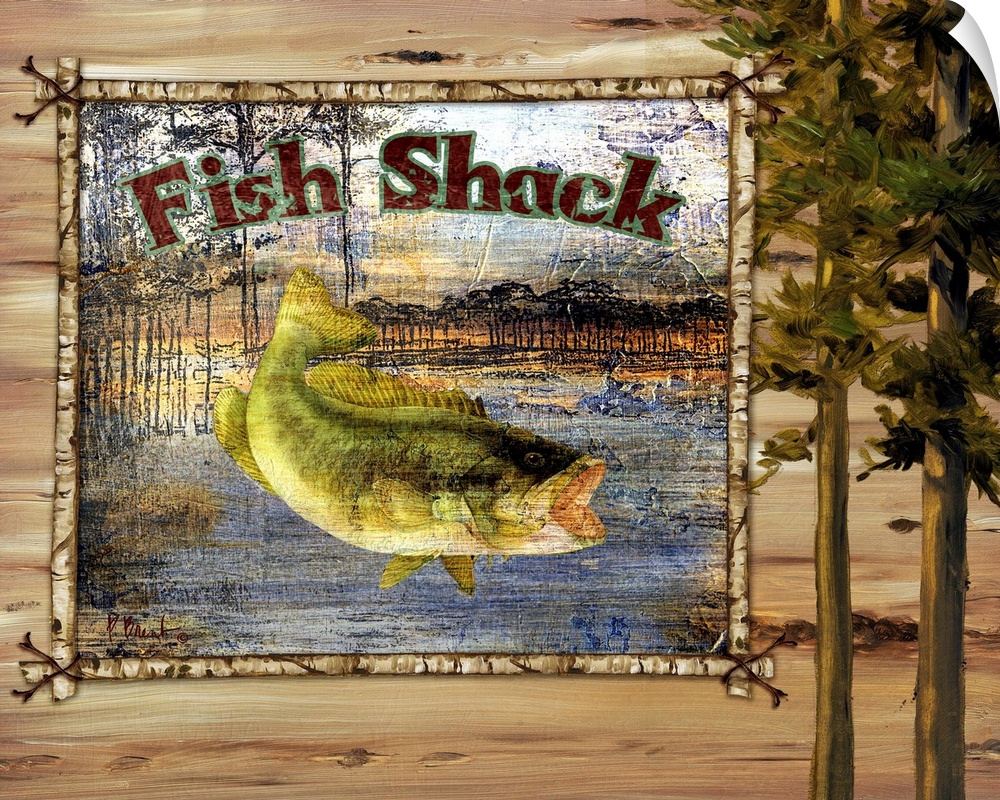 <p>Decorative artwork of a bass fish in a frame, with trees and the words Fish Shack.</p>
