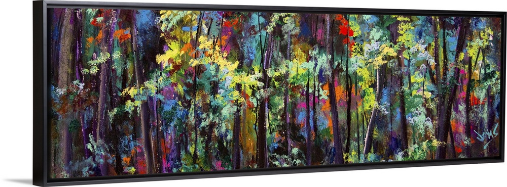 <p>A contemporary painting of a forest using a wide gamut of neon colors.</p>