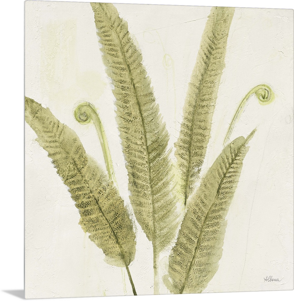 <p>Textured painting of a fern fronds on a white, square background.</p>