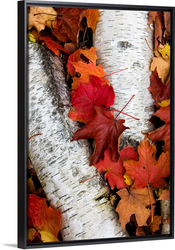 <p>Vertical panoramic photograph of long narrow tree bark on ground surrounded by fall leaves.</p>
