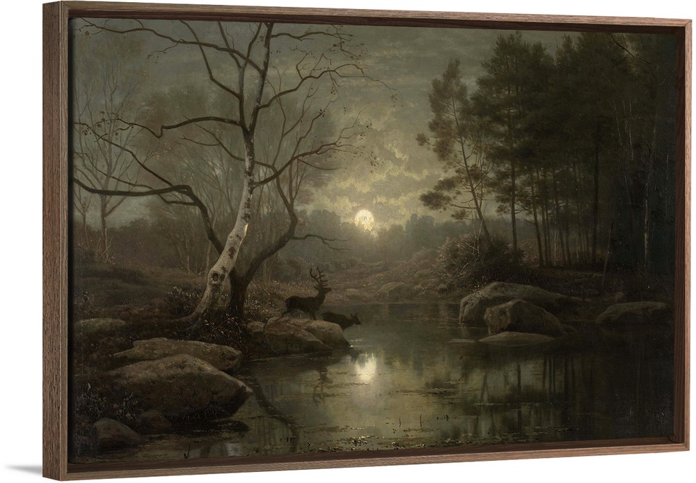 <p>Forest Landscape in the Moonlight, by Georg Eduard Otto Saal, 1861, Dutch painting, oil on canvas. Autumn night scene with deer at stream.</p>