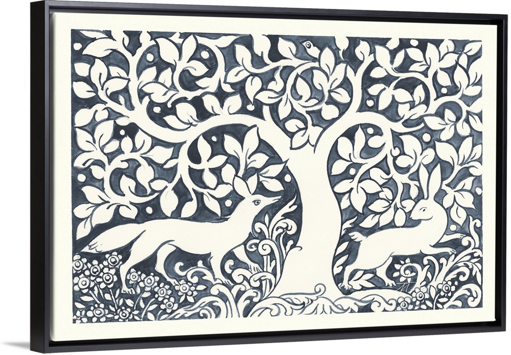 <p>Floral indigo and white watercolor painting with a fox and rabbit running around a tree.</p>