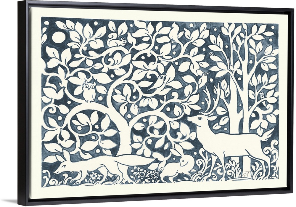 <p>Floral indigo and white watercolor painting with woodland creatures and trees.</p>
