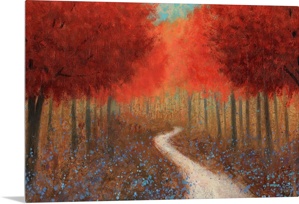 <p>Contemporary painting of a pathway through a forest of red trees.</p>