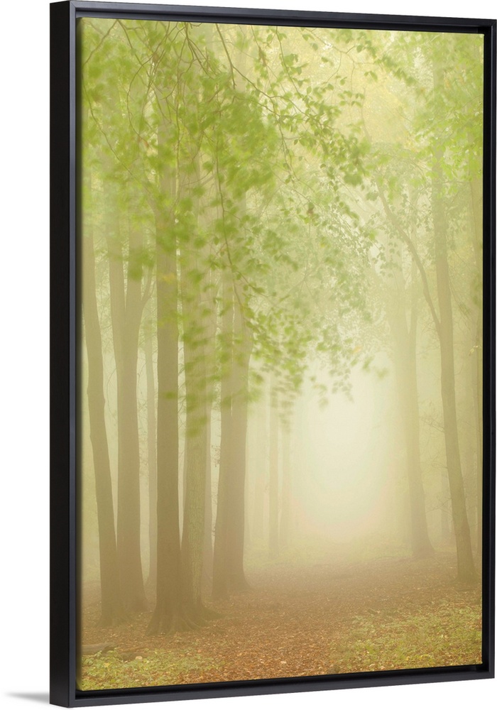 <p>An avenue of tall trees with fresh green leaves on a misty dawn morning.</p>
