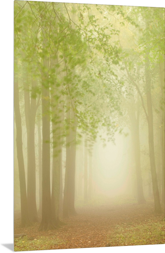<p>An avenue of tall trees with fresh green leaves on a misty dawn morning.</p>