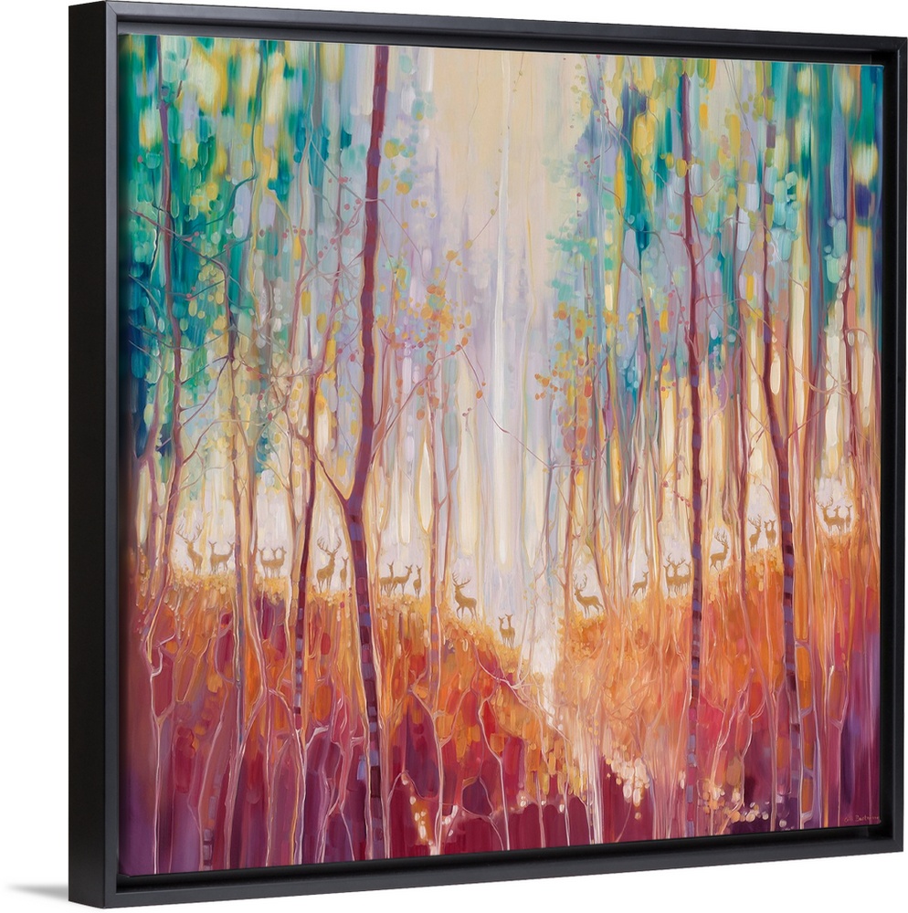 <p>Watercolor painting of deer, deep within a colorful, dream-like forest.</p>