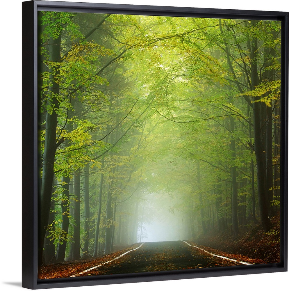 <p>Photograph of a shrouded forest road with bright green foliage and dense fog in the distance.</p>