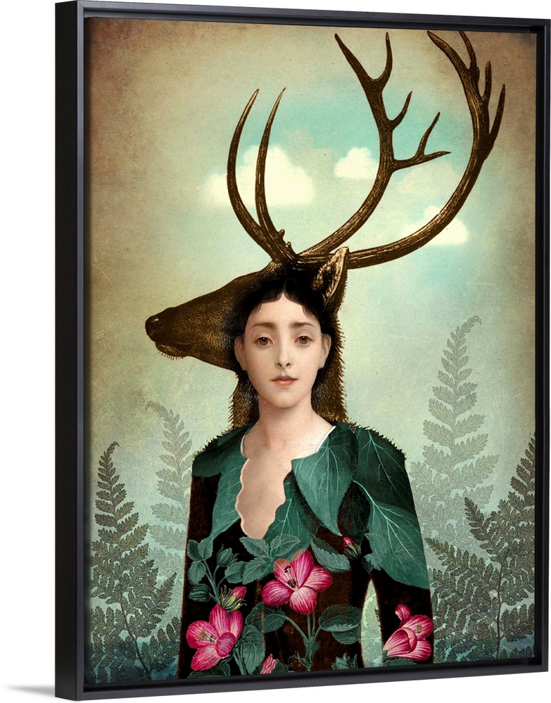 <p>A portrait of a young lady in a floral dress who is surround by large fern leaves. A profile of a stag is directly behind her head.</p>