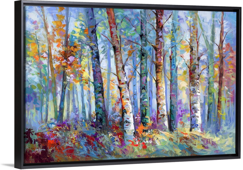<p>A forest of birch trees rises through a burst of autumn color, their trunks standing tall against a soft, glowing background. Warm yellows, cool purples, and bold reds weave through the leaves and forest floor, creating a rich, immersive landscape. This expressive composition captures the magic of nature alive with color and light.</p>