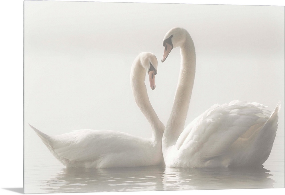 <p>Two Mute Swans swim closely together, their arched necks creating the image of a heart.</p>