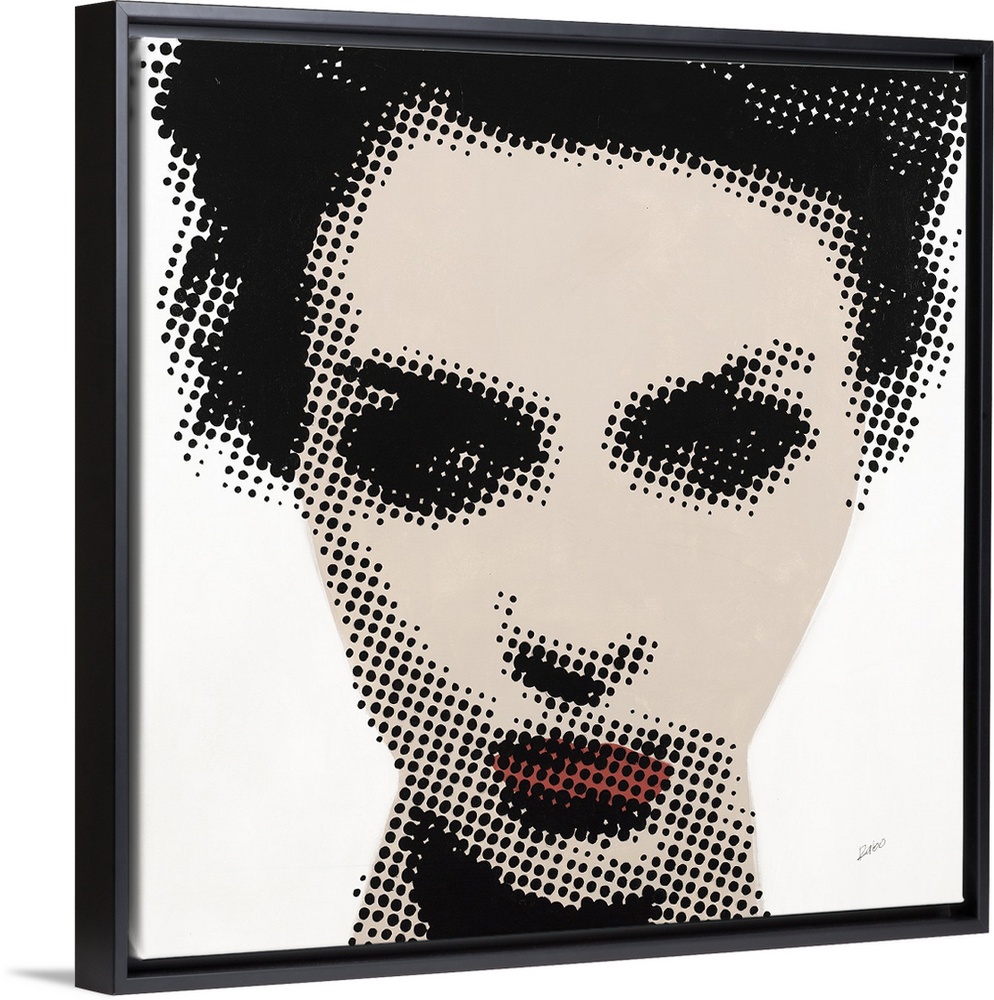 <p>Square illustration of a woman's face created with black dots over beige and red paint on a white background.</p>