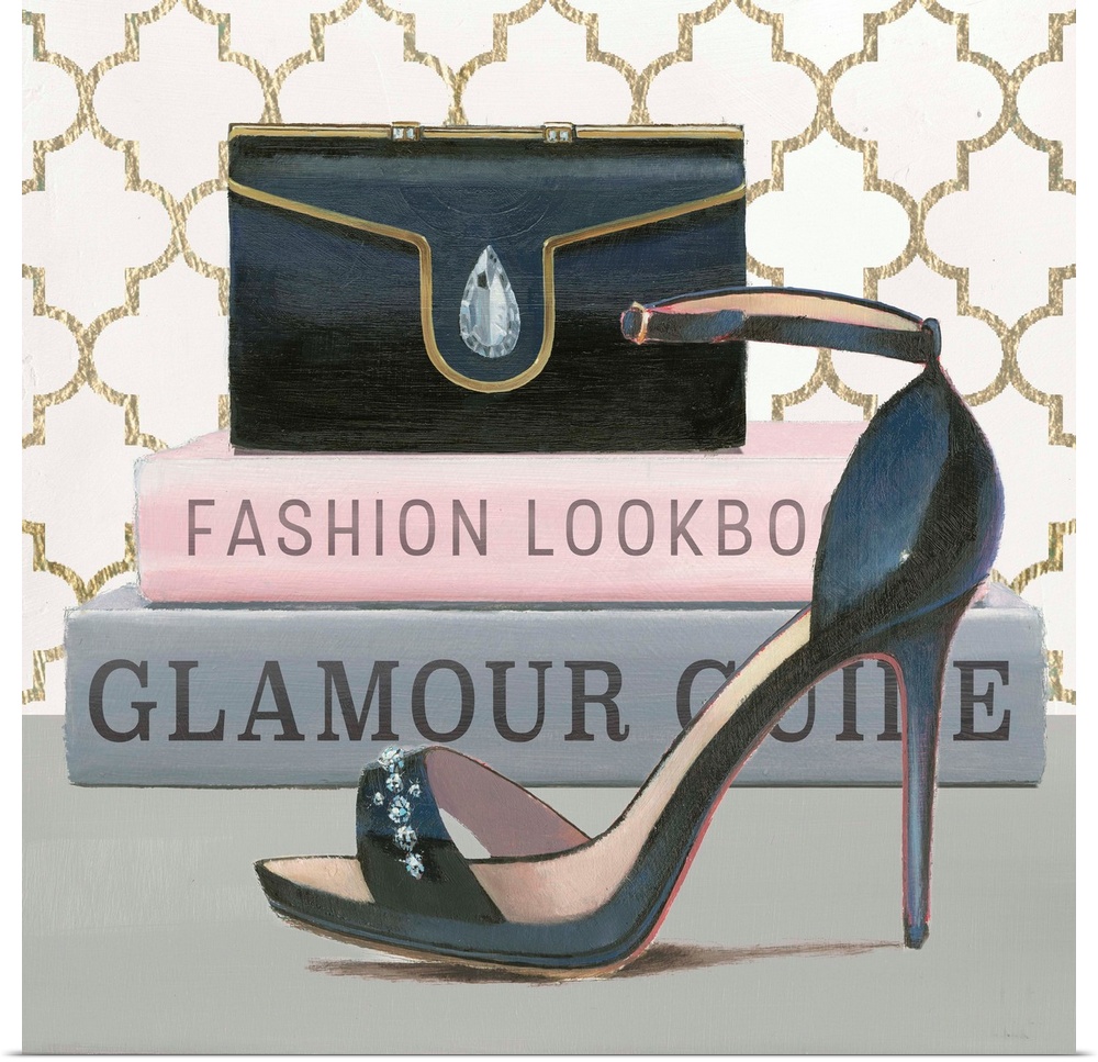 <p>Still life painting of a stylish high heel, clutch, and two fashion books.</p>
