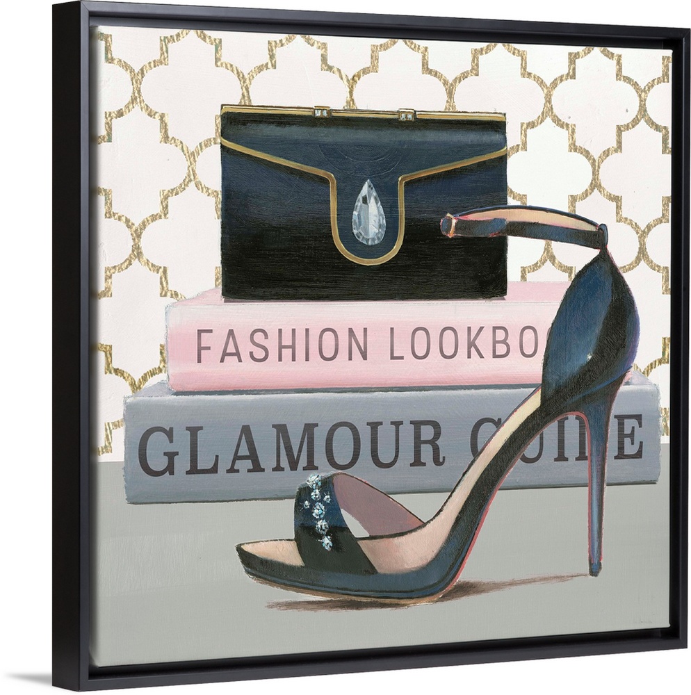 <p>Still life painting of a stylish high heel, clutch, and two fashion books.</p>