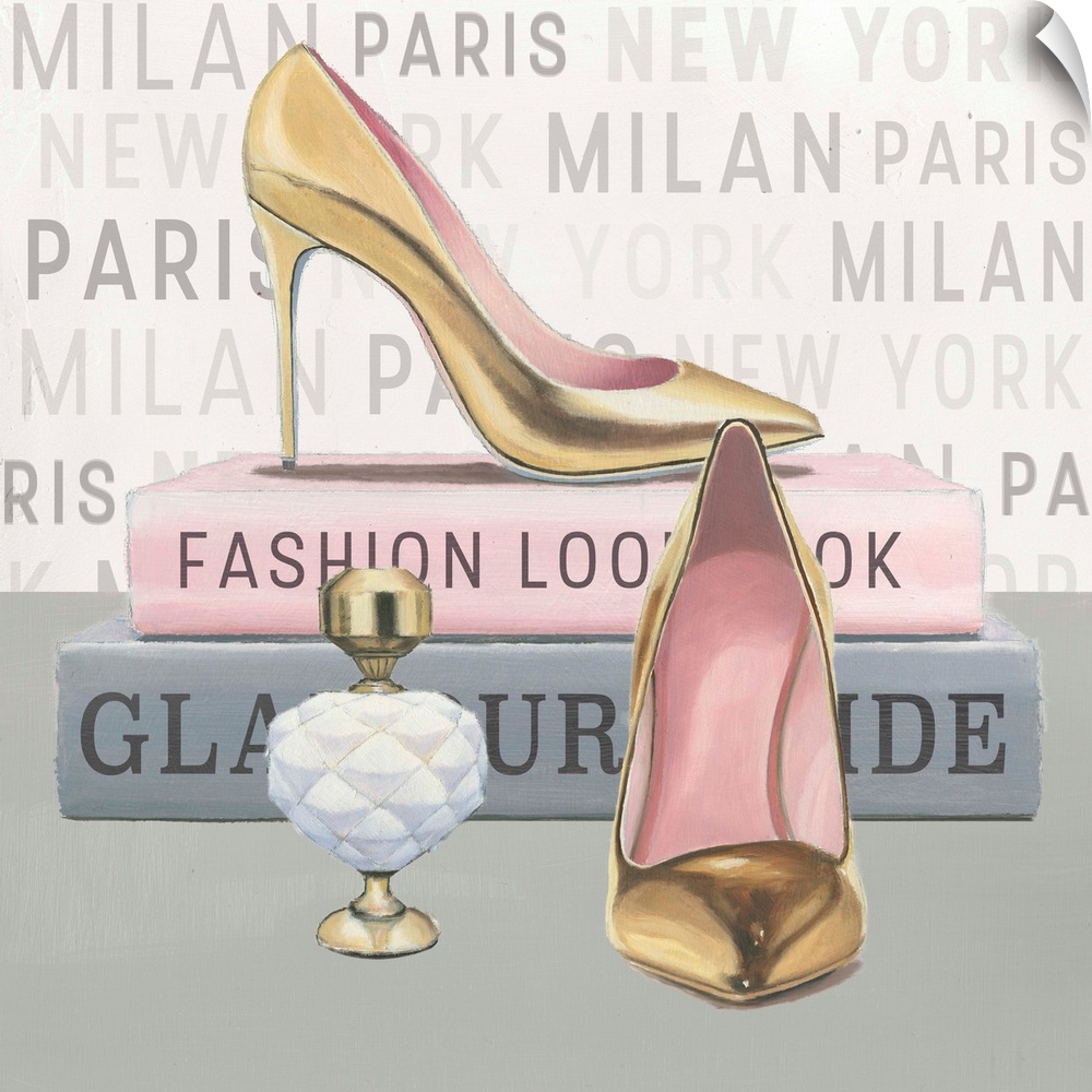 <p>Contemporary still life painting of stylish gold high heels, clutch, perfume bottle, and fashion books.</p>