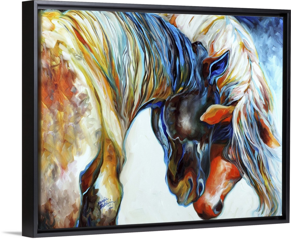 <p>Contemporary painting of two colorful horses nuzzling their heads together.</p>