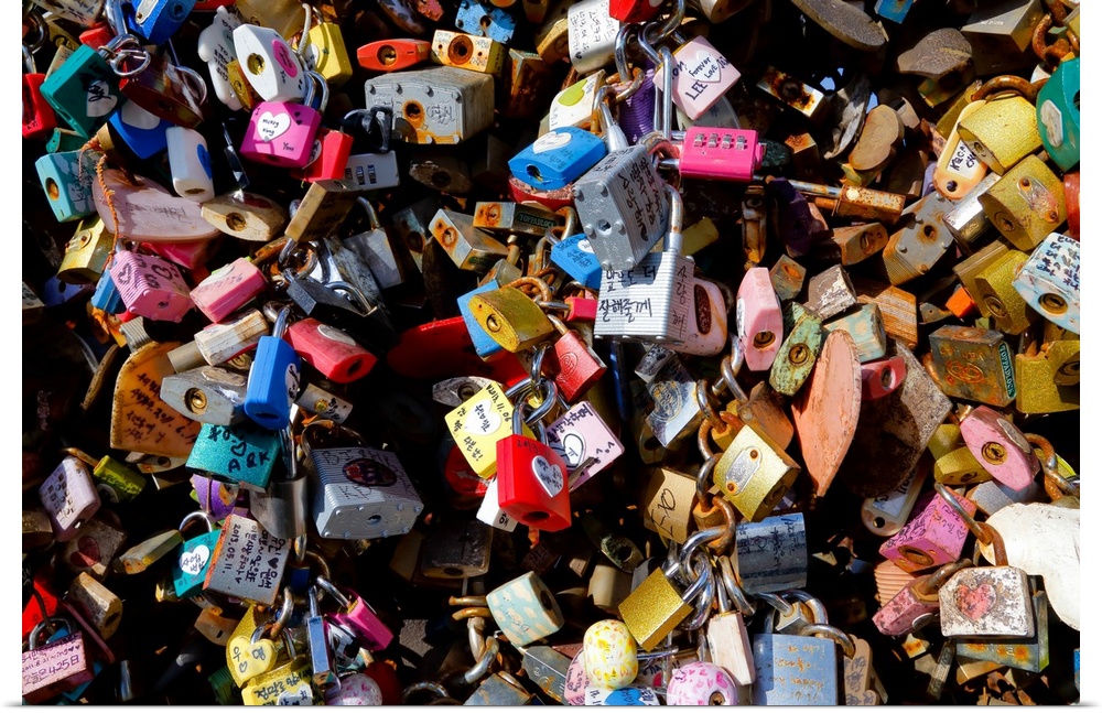 <p>Forever love" - Love locks on fence at Seoul tower, Seoul, South Korea - Tourist spot where lovers place ceremonial locks to their love, Seoul, South Korea.</p>