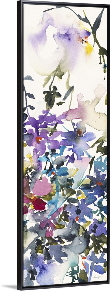 <p>Vertical watercolor painting of a variety of flowers in a garden.</p>