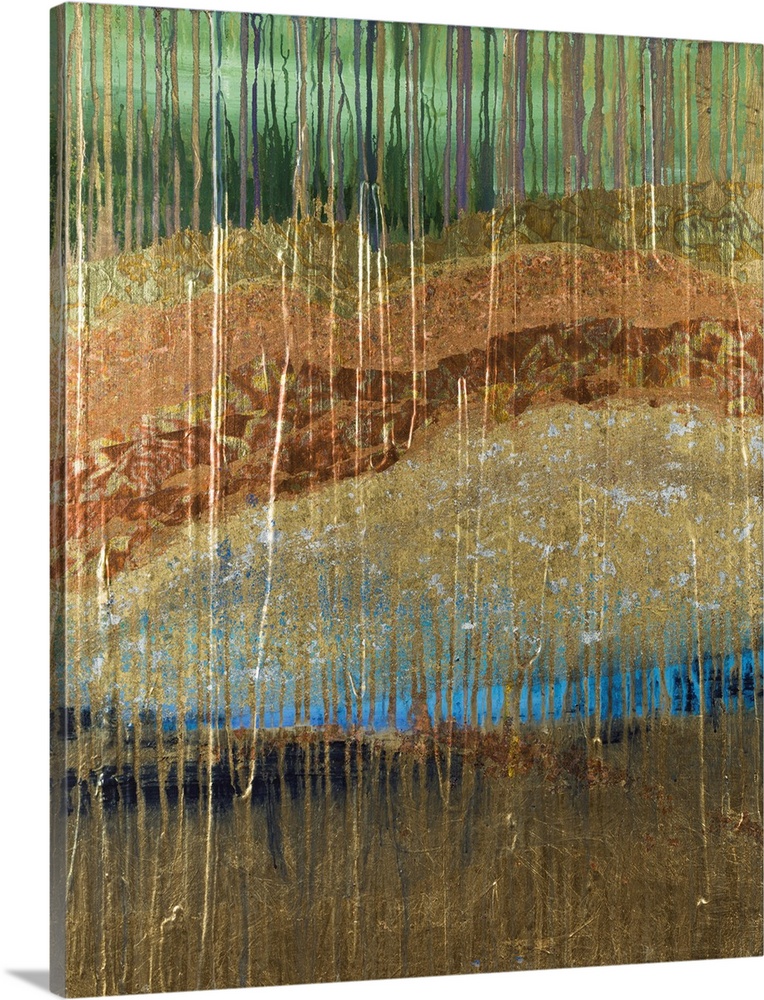 <p>Abstract art featuring layered earthy tones, shimmering gold textures, and vibrant blue, traversed by vertical streaks suggesting a stylized forest, rain, or light.</p>