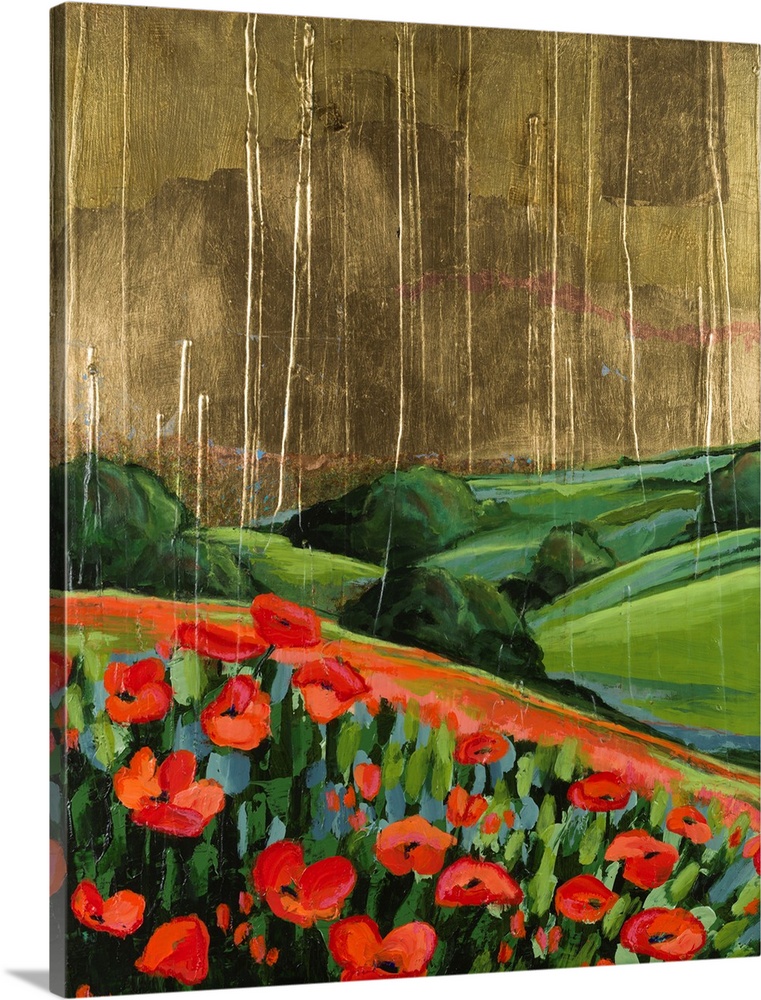 <p>Vibrant painting of a poppy field with rolling green hills under a striking golden, textured sky with vertical streaks. Rich colors & impasto texture create a dynamic landscape.</p>