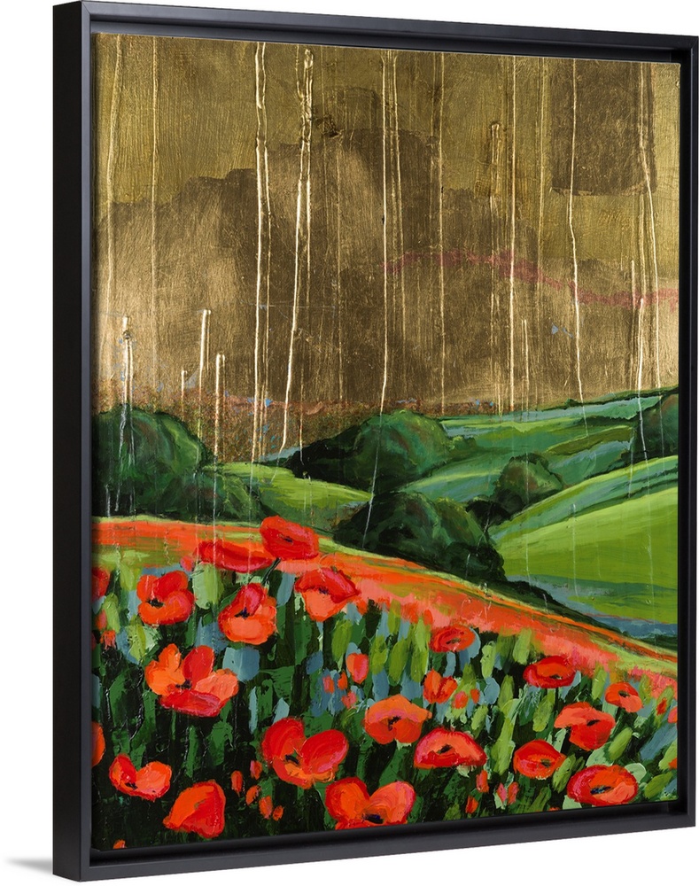 <p>Vibrant painting of a poppy field with rolling green hills under a striking golden, textured sky with vertical streaks. Rich colors & impasto texture create a dynamic landscape.</p>