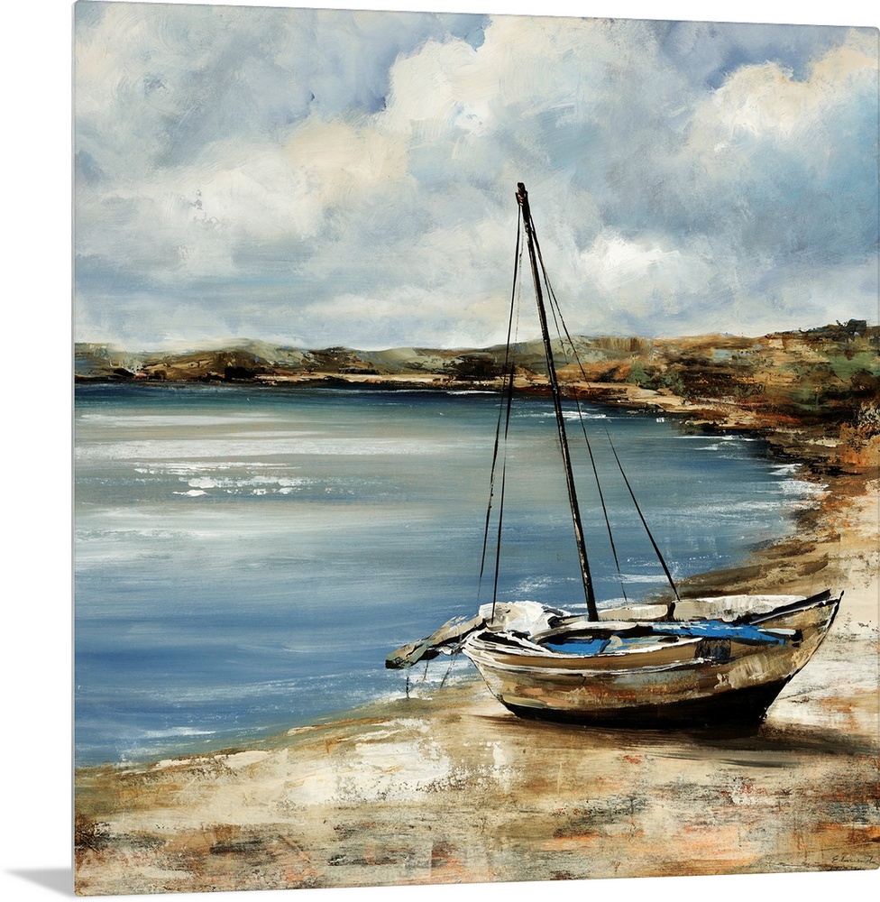 <p>Square painting of a sailboat sitting on the shore with water near it.</p>