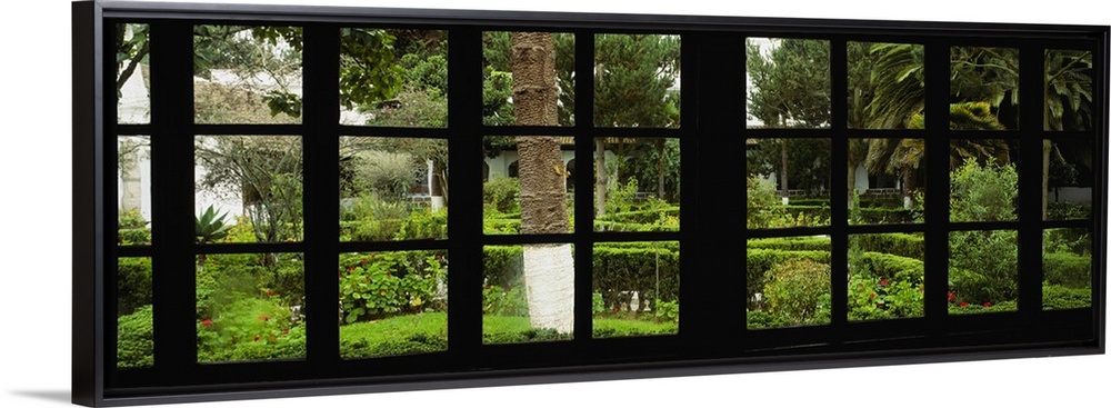 <p>Panoramic image looking out of a silhouetted window into a garden.</p>