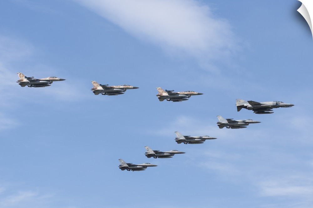 <p>Mixed formation of the participants of international Exercise Iniohos 2017 in Andravida, Greece, composed by a Hellenic Air Force F-4E (AUP) Phantom II and F-16C Block 52, flying toghether with Israeli Air Force F-16 Block 40 Barak.</p>
