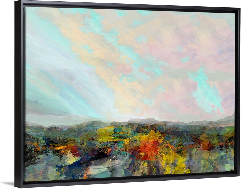 <p>Abstract artwork with a colorful hilly landscape and a pastel sky.</p>
