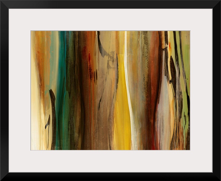 <p>Warm-toned abstract painting featuring flowing areas of color and smooth brushstrokes moving downwards on the canvas.</p>