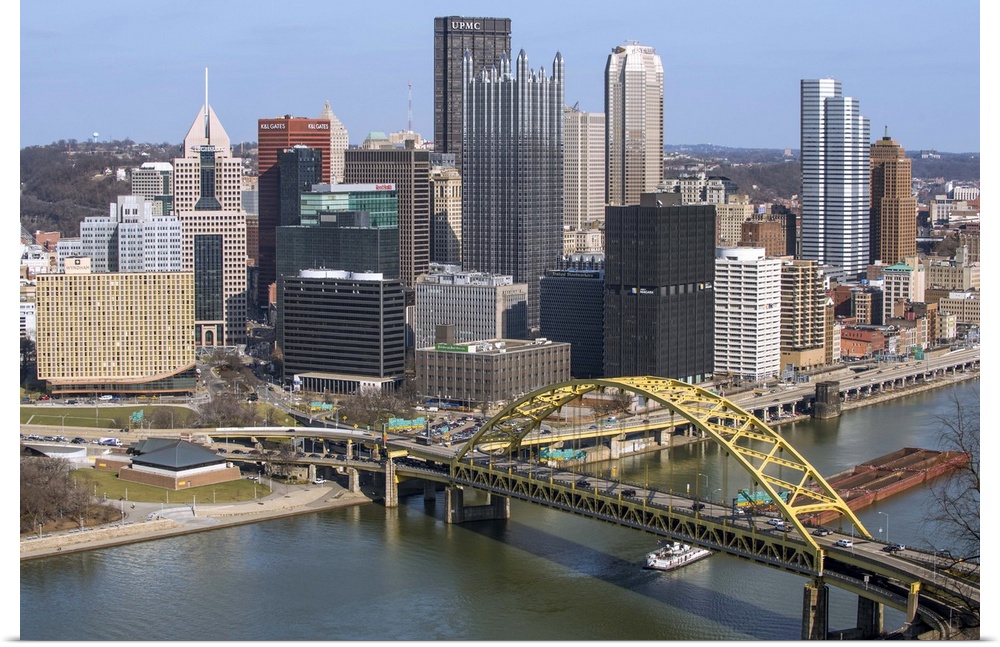 <p>Aerial view of Pittsburgh, Pennsylvania, with the Fort Pitt Bridge leading into the city.</p>