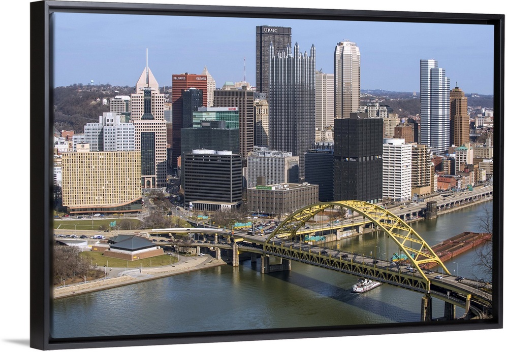 <p>Aerial view of Pittsburgh, Pennsylvania, with the Fort Pitt Bridge leading into the city.</p>