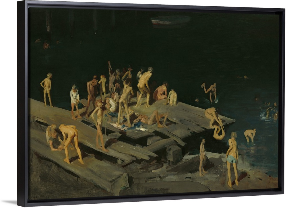 <p>Forty-two Kids, by George Bellows, 1907, American painting, oil on canvas. A band of lanky, nude, and semi-clad boys are engaged in a variety of anticsswimming, diving, sunbathing, smoking, and urinatingon and near a dilapidated wharf jutting out over t</p>