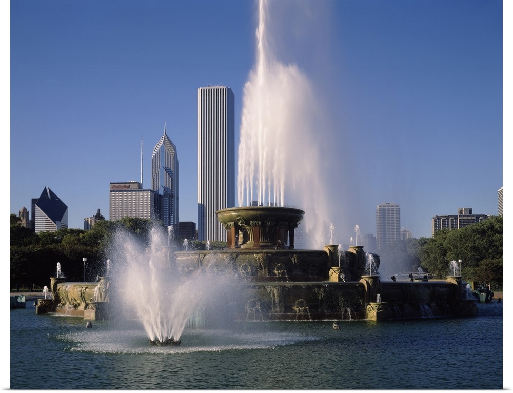 <p>This massive fountain is photographed in front of skyscrapers in the city of Chicago.</p>