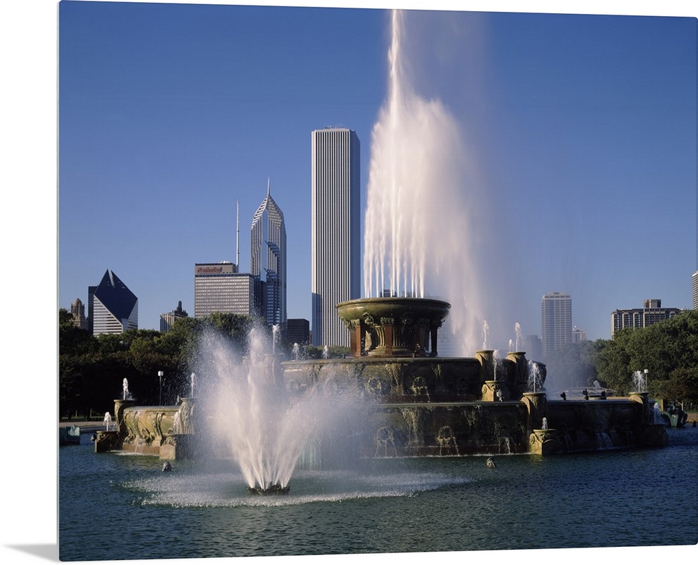 <p>This massive fountain is photographed in front of skyscrapers in the city of Chicago.</p>