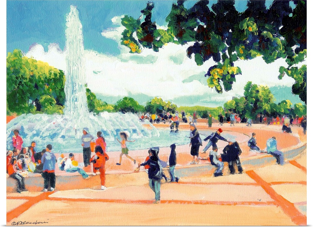 <p>Fountain in Balboa Park, San Diego, painting by RD Riccoboni. A favorite spot for kids. Children gather around the fountain on a beautiful sunny day in the park.</p>