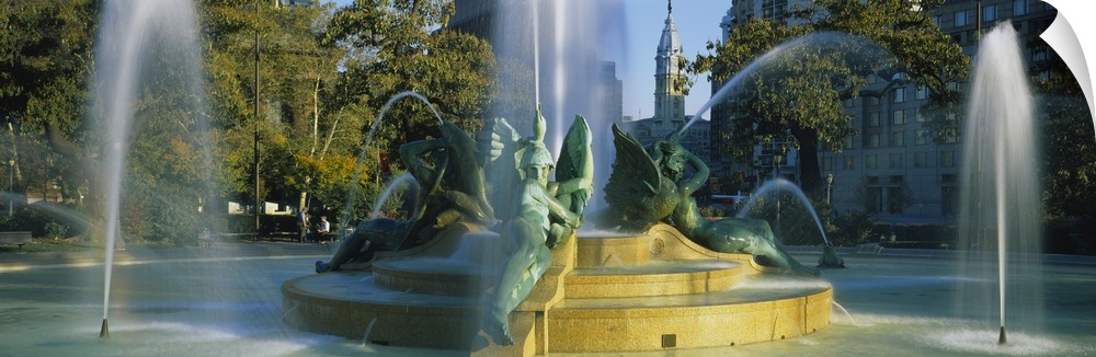 <p>Three bronze statues part of a larger fountain display dispel water from pipes above their heads in this amazing urban monument in a panoramic photograph.</p>