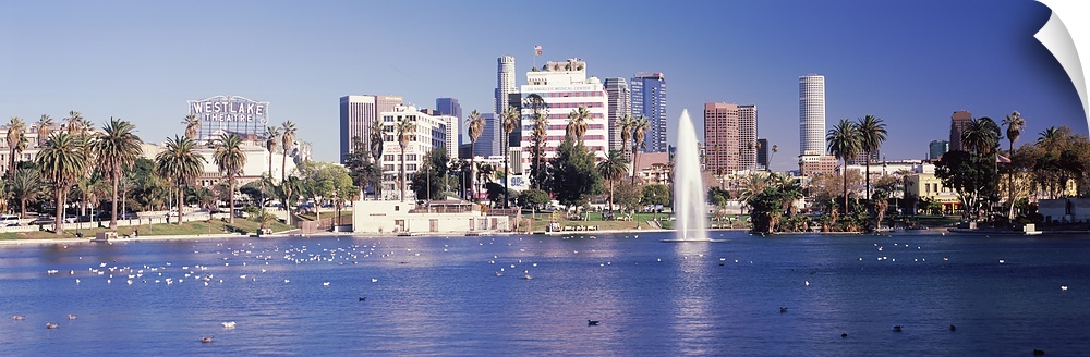 <p>Fountain in front of buildings, Macarthur Park, Westlake, City of Los Angeles, California, USA</p>