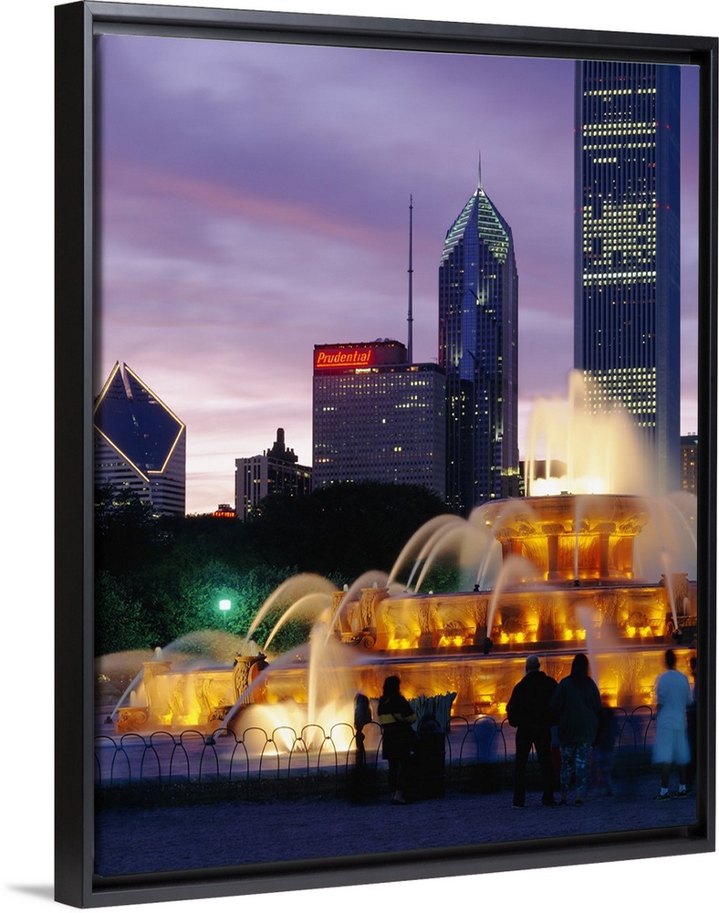 <p>Vertical photograph on a large wall hanging of Buckingham Fountain, lit at night, in Grant Park, Chicago, Illinois. Skyscrapers in the background include, the Prudential building and the Crain Communications Building.</p>