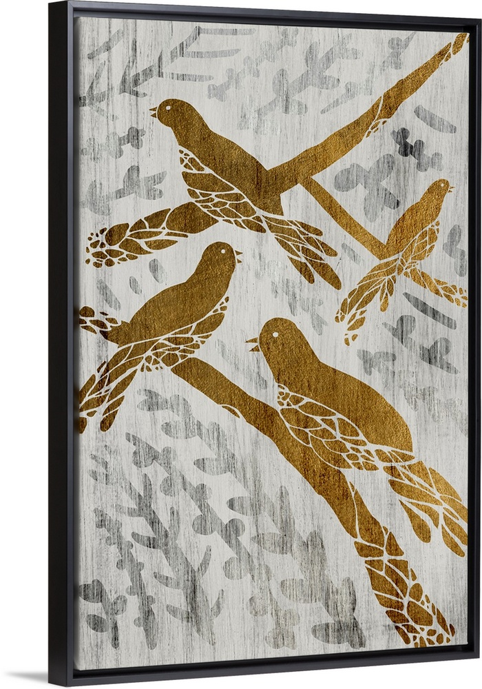 <p>Gold leaf on weathered wood with a fern pattern of four birds on branches.</p>