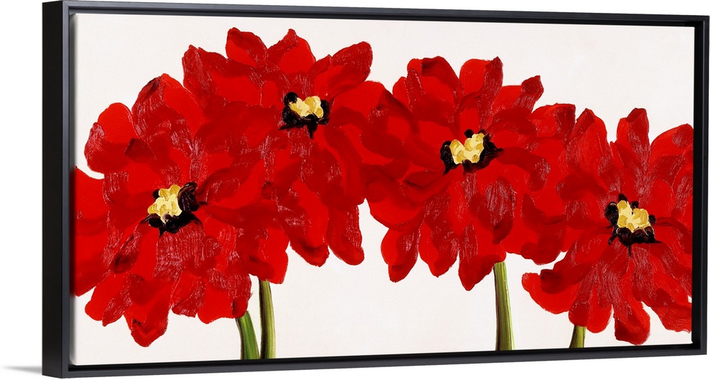 <p>Panoramic contemporary art portrays a group of warm toned flowers against a blank background. Artist uses a lot of short brush strokes to represent the numerous petals on each flower.</p>