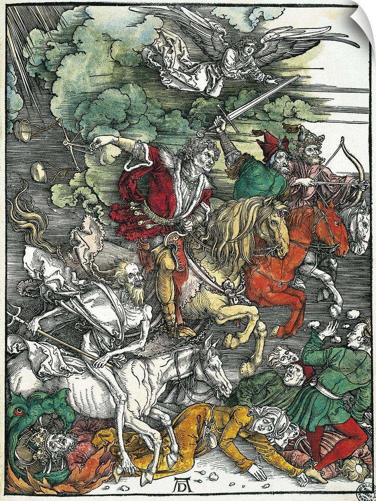 <p>DURER, Albrecht (1471-1528). Apocalypse of St. John. 1496-1498. Foiur Horsemen of the Apocalypse: Pestilence, War, Famine and Death. Xylography. ITALY. Venice. Correr Museum Library. -</p>