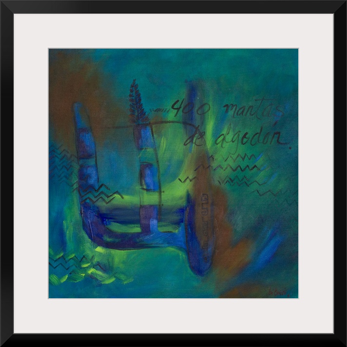 <p>Leal Barcelo evokes ancient codices painted by hand by native peoples in Mexico. Working in acrylic on canvas, he depicts hieroglyphs and inscribes the phrase 400 blankets of cotton, suggesting an ancient catalogue of tribute. Barcelo is a member of Callinart Artists. Titled 400 mantas de algodon in Spanish.</p>