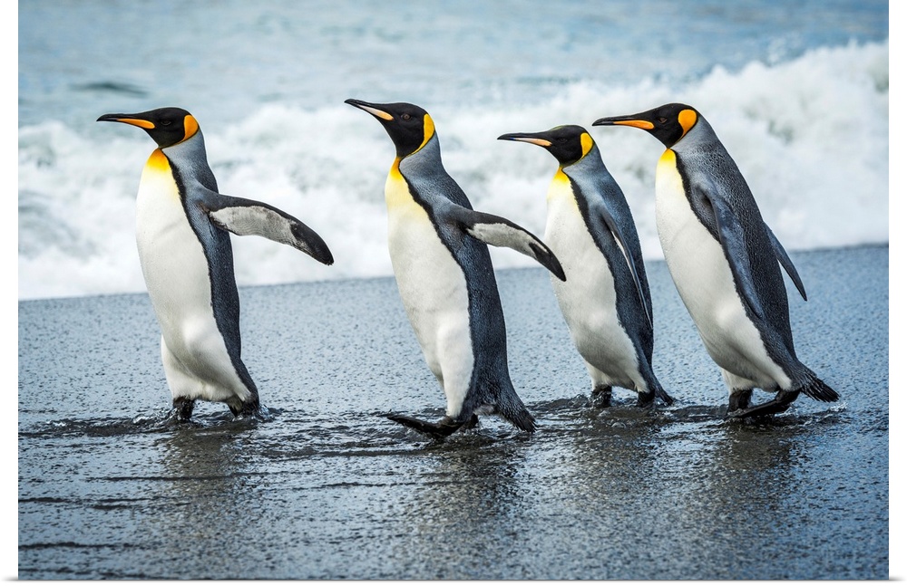 <p>Four king penguins (Aptenodytes patagonicus) walking together on beach; Antarctica</p>