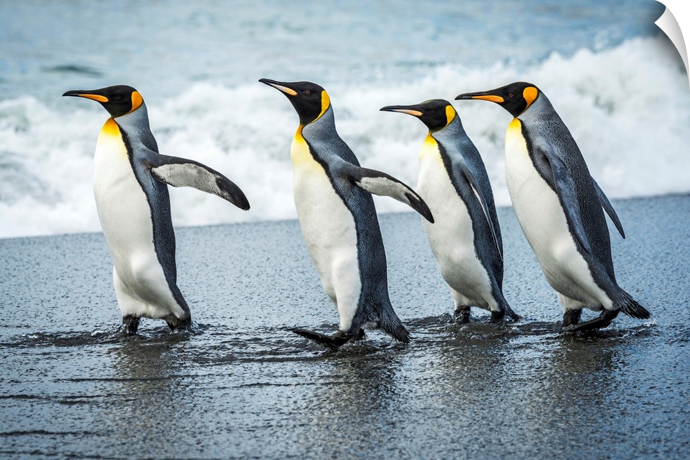 <p>Four king penguins (Aptenodytes patagonicus) walking together on beach; Antarctica</p>