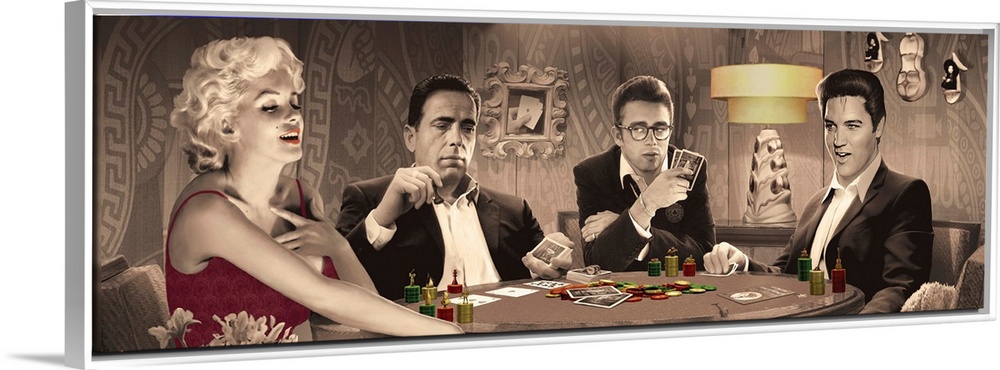 <p>Painting of Marilyn Monroe, Humphrey Bogart, James Dean, and Elvis Presley playing cards together.</p>
